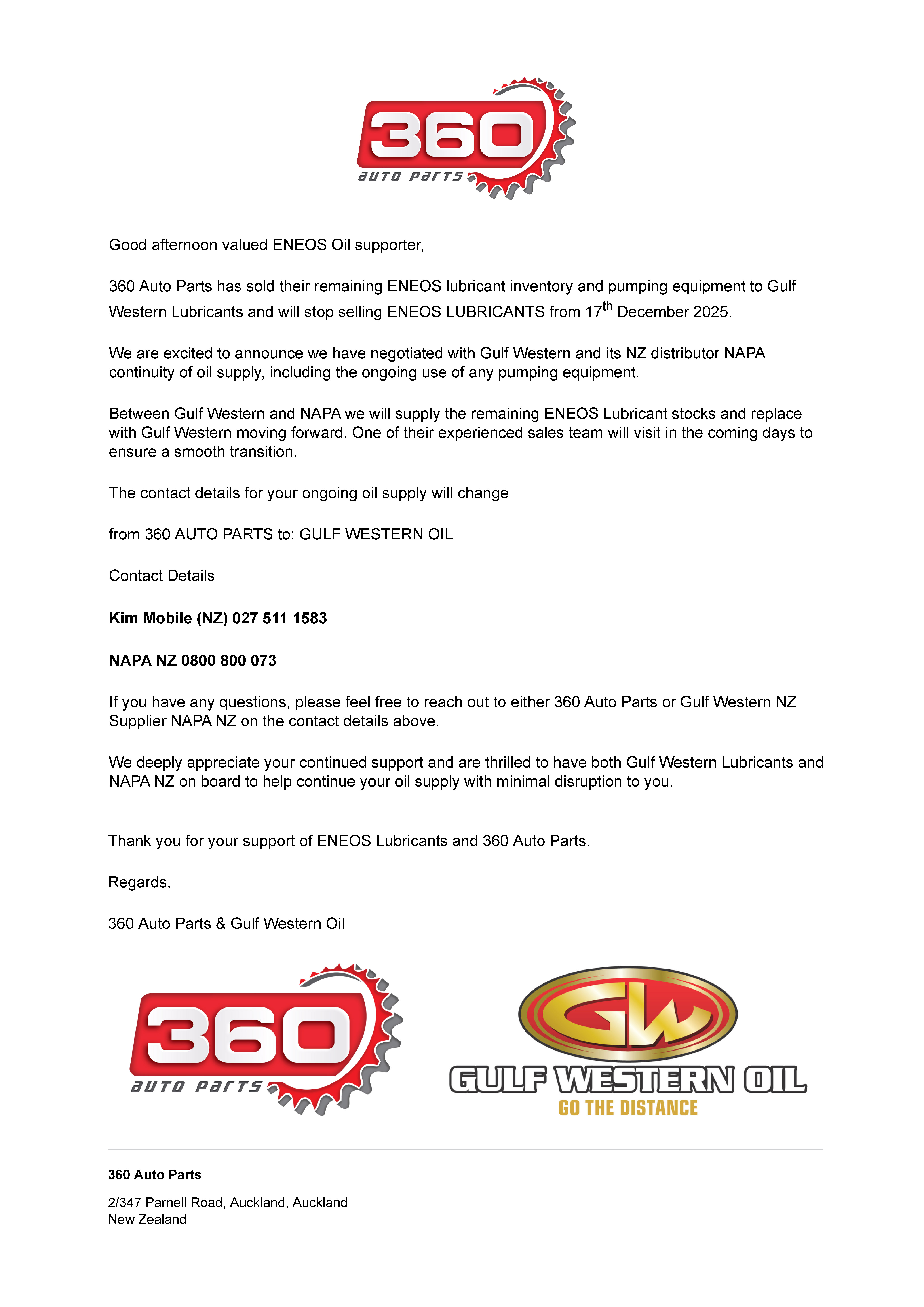 360 Auto Parts is the proud sole distributer of ENEOS Motor Oil in New Zealand. ENEOS lubricants provide unparalleled performance, power, and protection across a wide range of applications, from race cars and motorcycles, to passenger vehicles.
